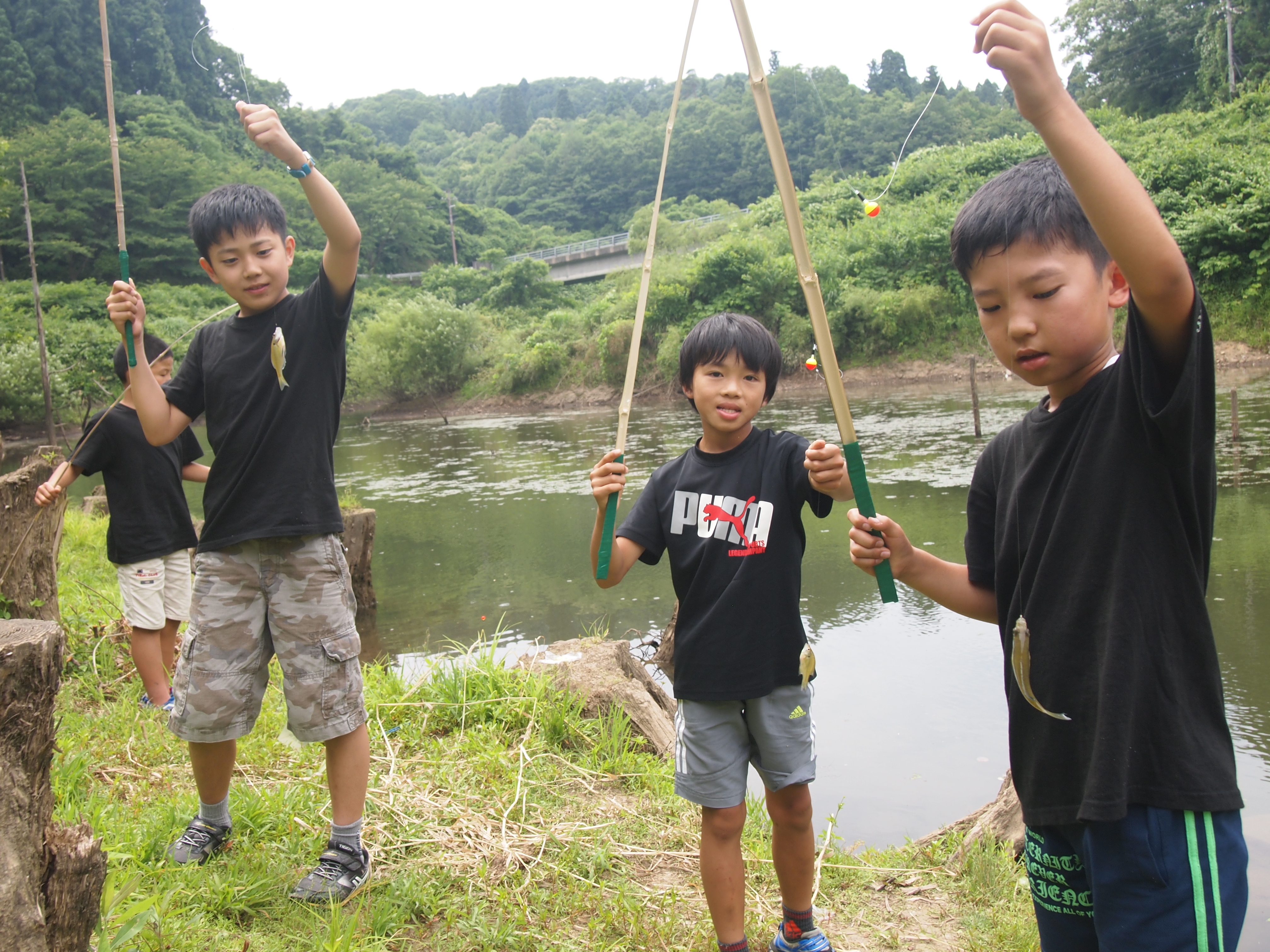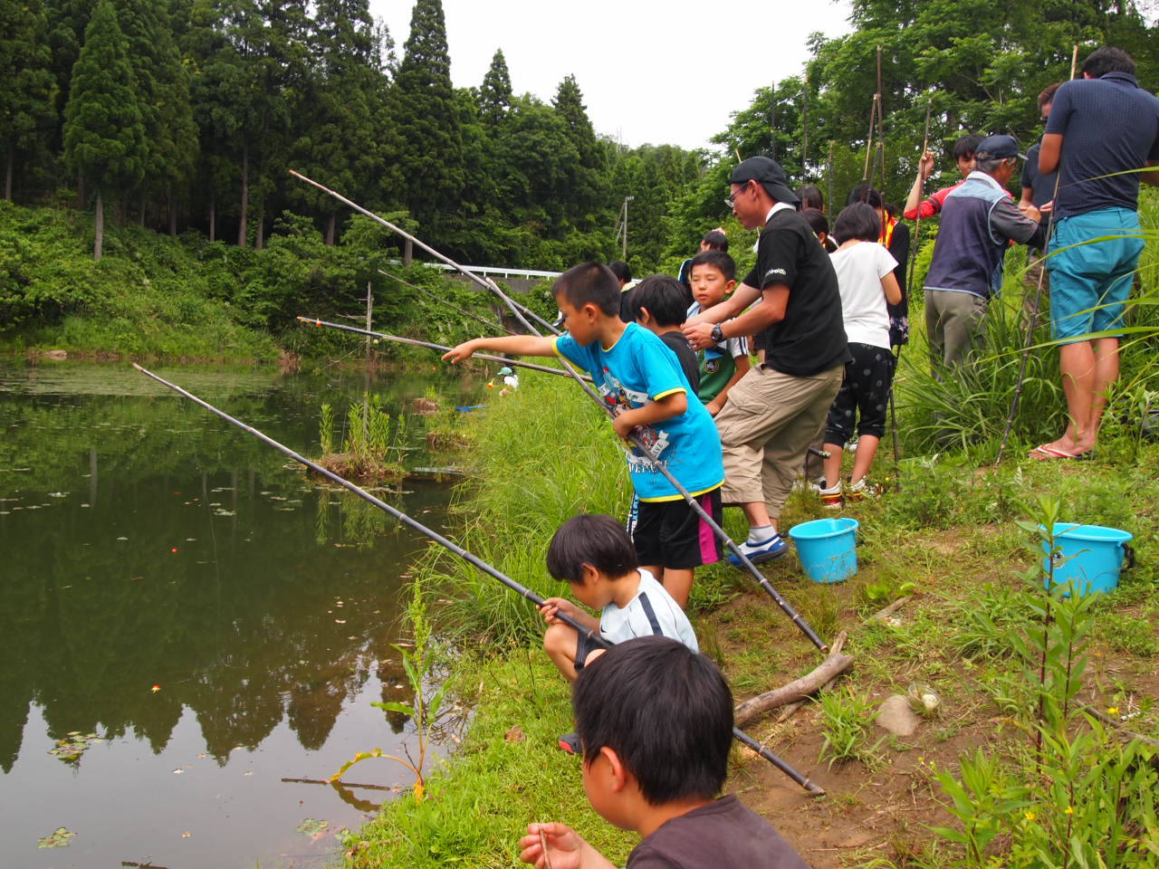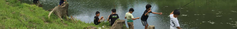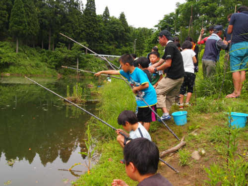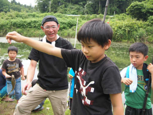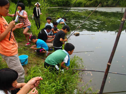 食事のあとは近くの池で魚釣りやゲームを楽しみます。