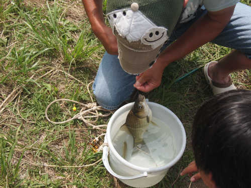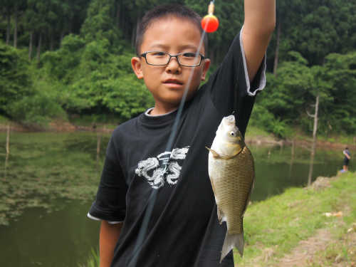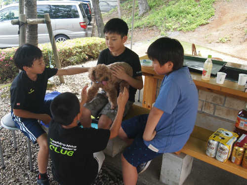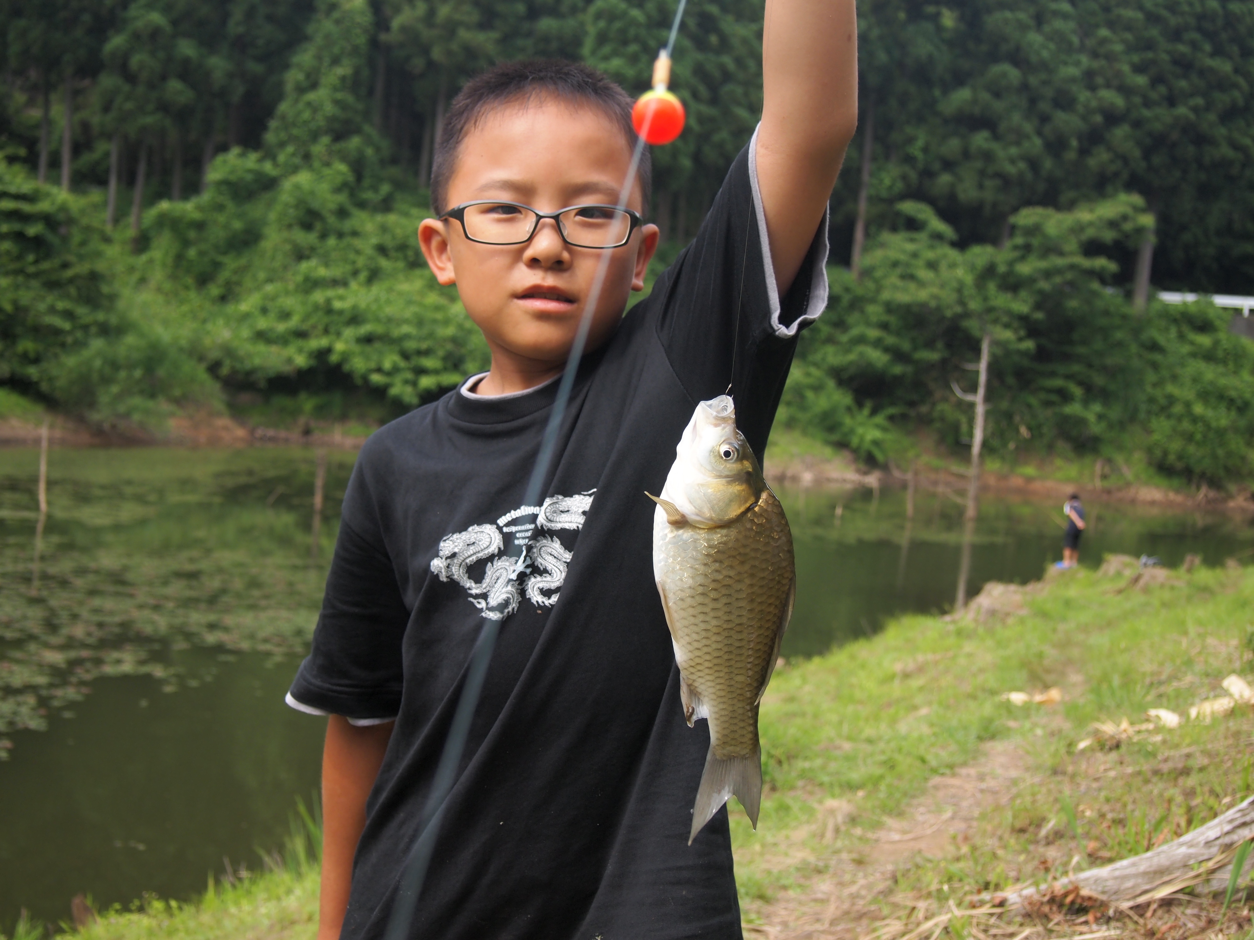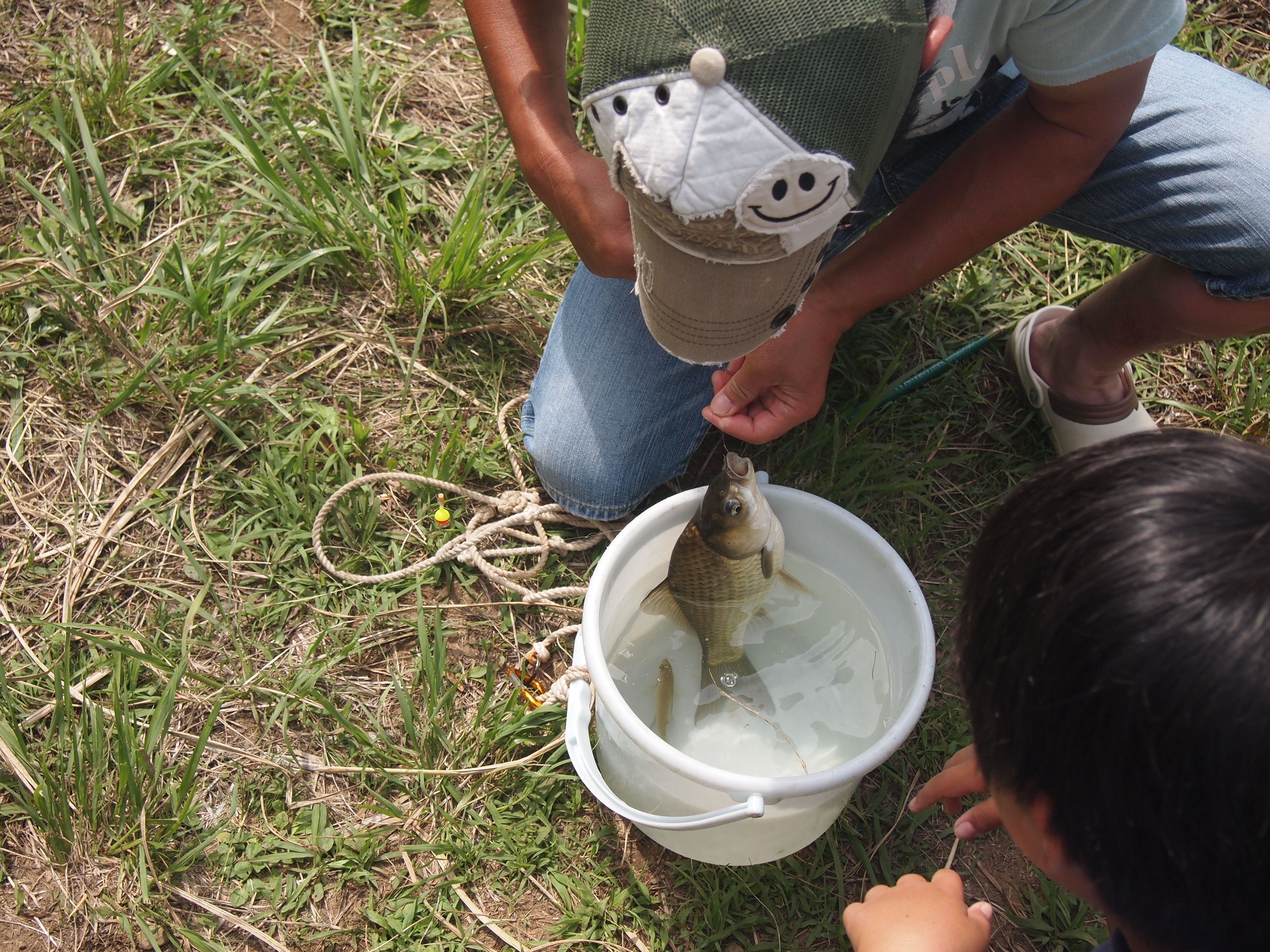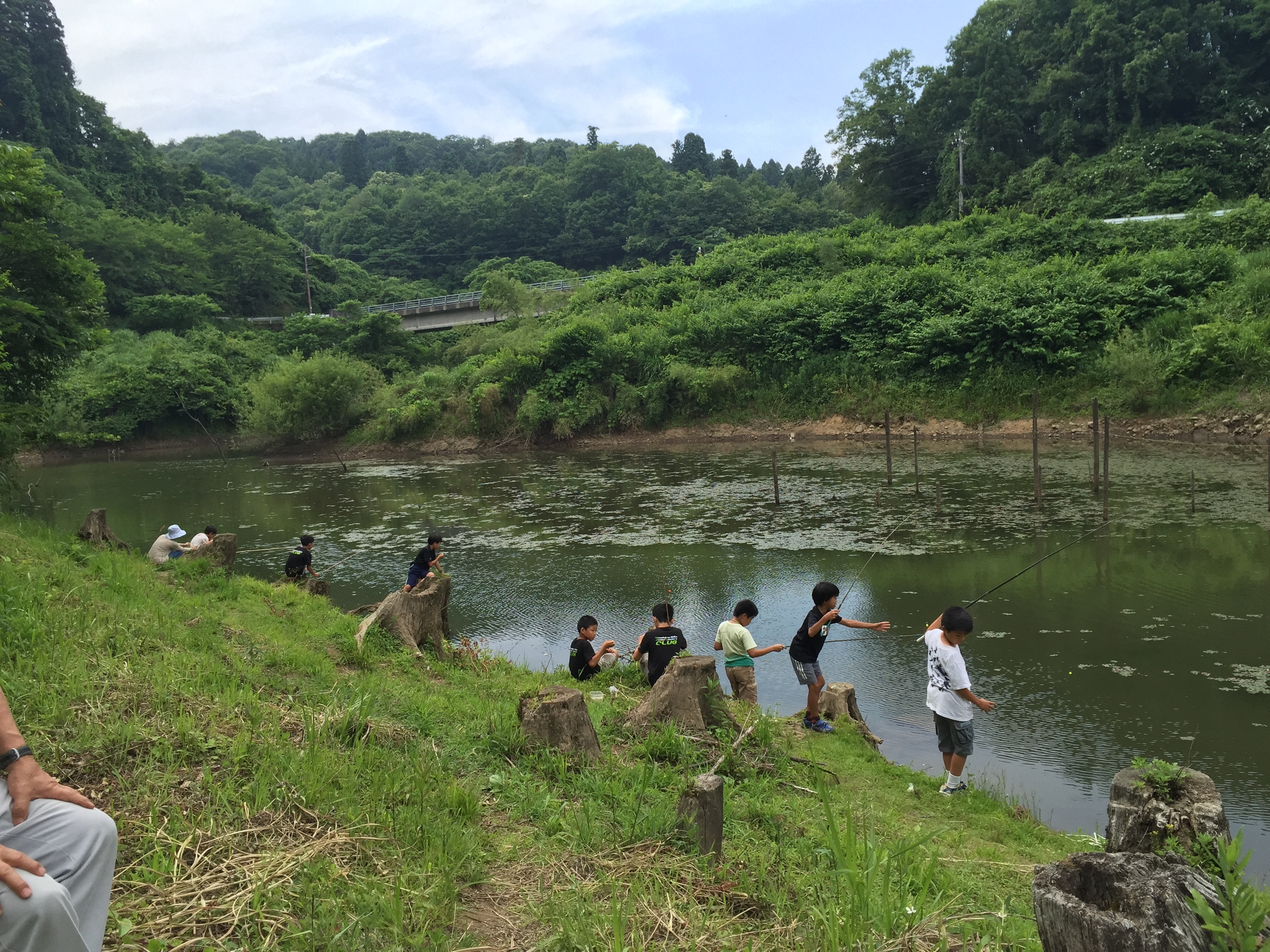 食事のあとは近くの池で魚釣りやゲームを楽しみます。
