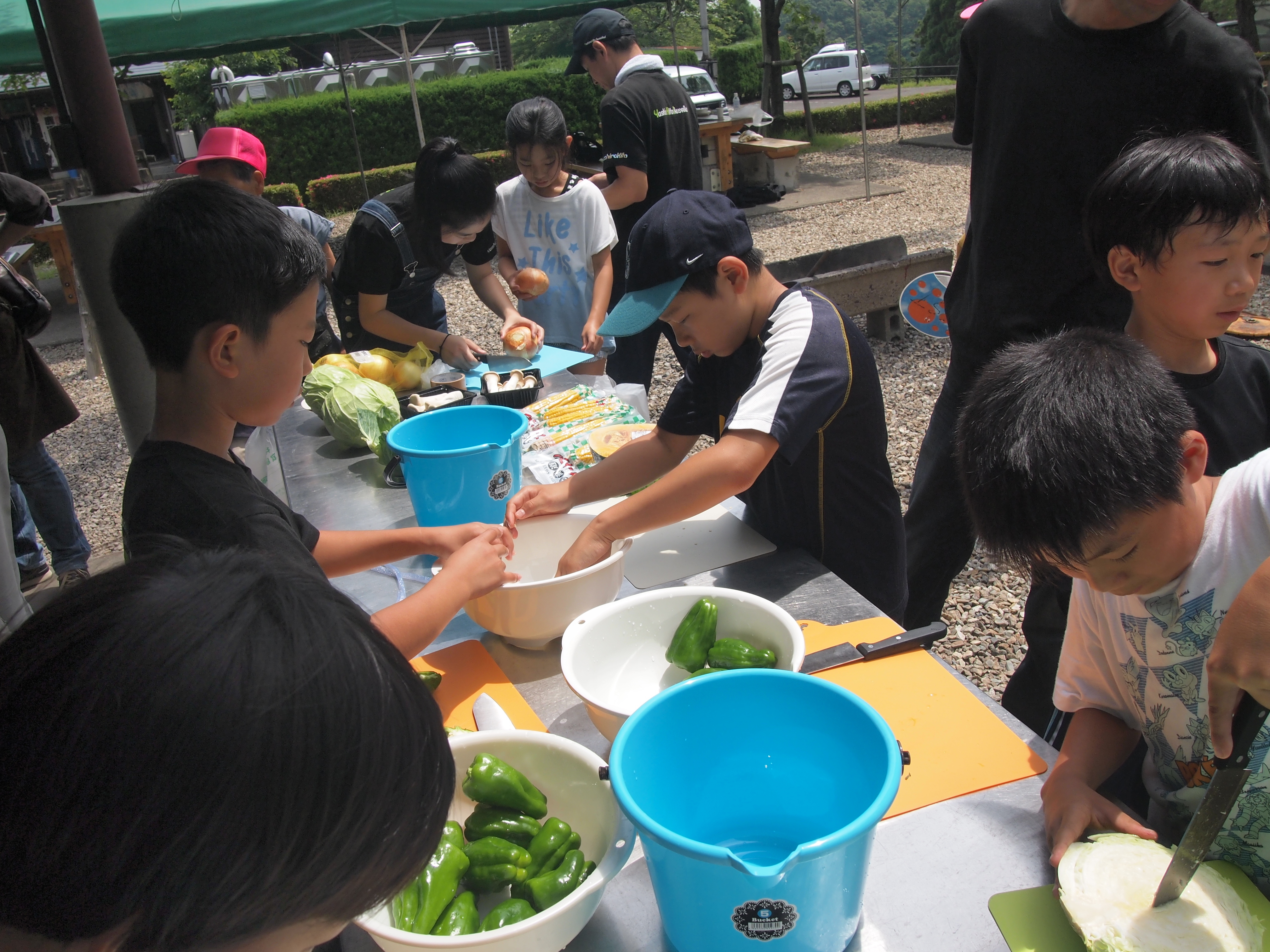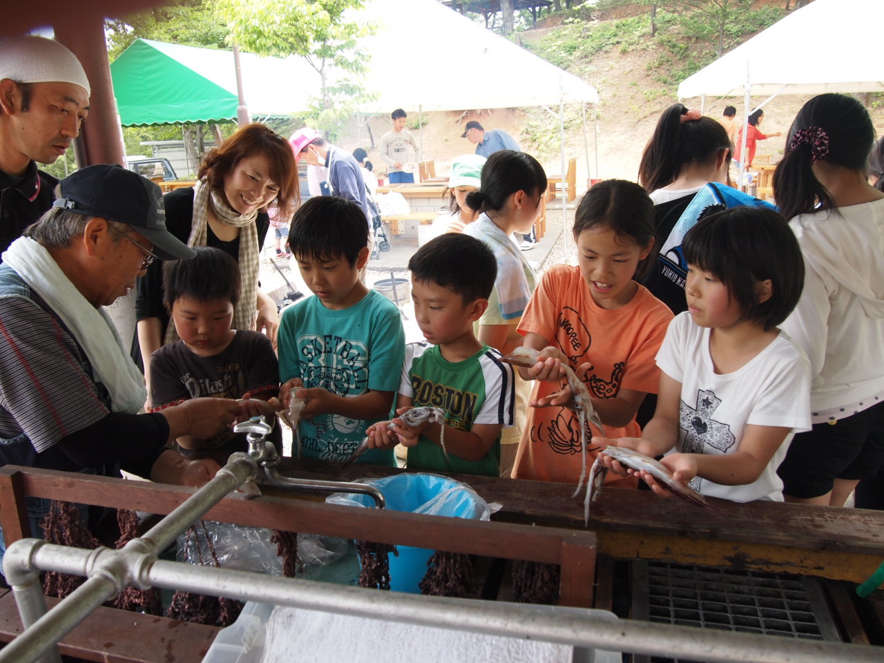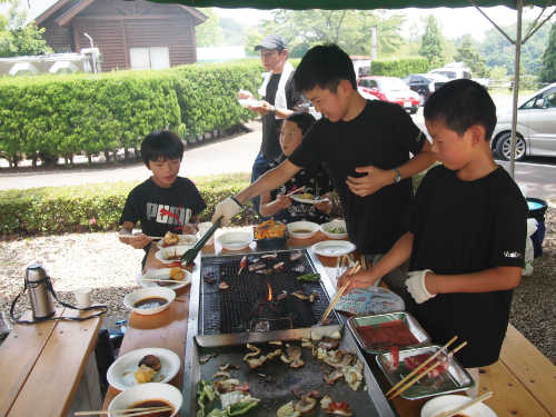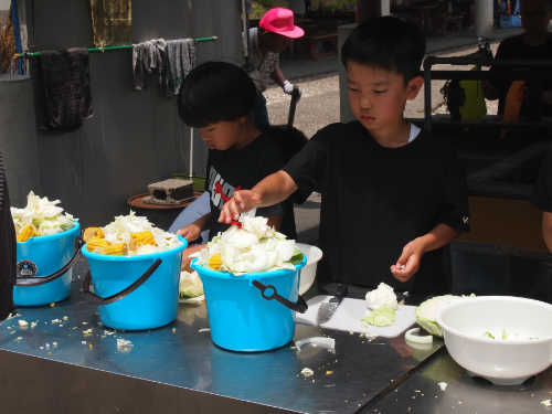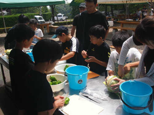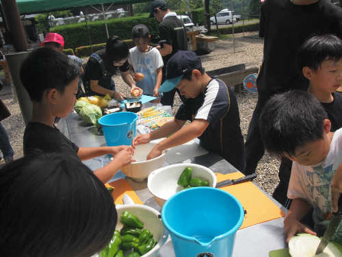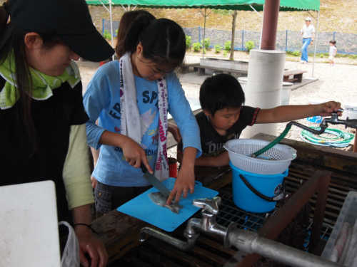 食事の準備で野菜を切ったり、魚やイカの捌き方を習います。