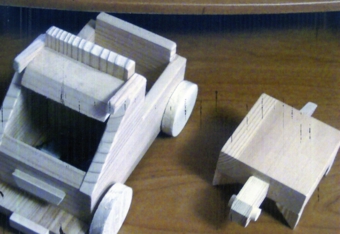 地元の間伐材を利用した木片でオルゴール付き水車やトラック、かめやゴム鉄砲を作りました。